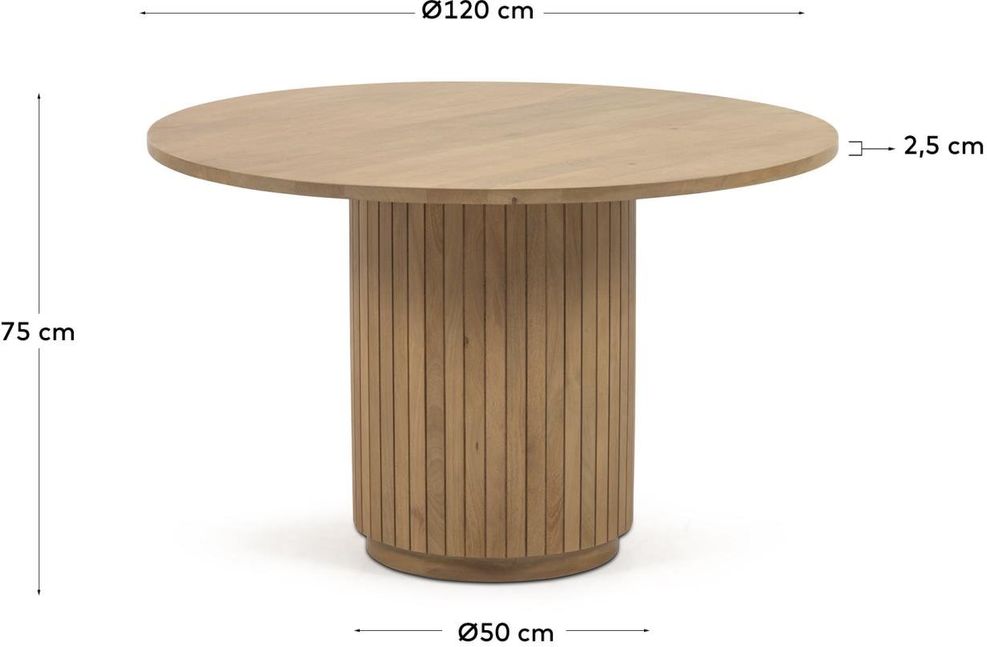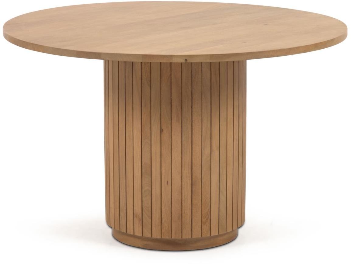 De Kave Home ronde tafelLicia van massief mangohout met natuurlijke afwerking brengt een verfijnde, organische sfeer in je interieur. Het rijke houtpatroon en de warme tinten maken van deze tafel een stijlvolle blikvanger die direct gezelligheid toevoegt. Dankzij het stevige, mangohout is hij zowel functioneel als elegant en geschikt voor alledaags gebruik of sfeervolle diners in huis.