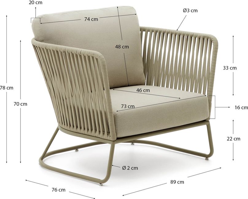 De Saconca Fauteuil van Kave Home is gemaakt om buiten te genieten, het hele jaar door. Het stevige stalen frame en het met de hand gevlochten touw geven hem een stoere én gezellige uitstraling. De uv-bestendige materialen houden hem mooi, seizoen na seizoen. Inclusief zachte kussens met afneembare hoezen voor extra comfort. Licht van gewicht, dus makkelijk te verplaatsen naar jouw favoriete plekje. Verkrijgbaar in meerdere kleuren.