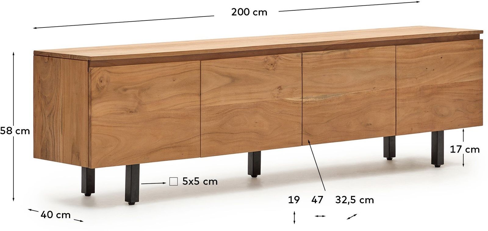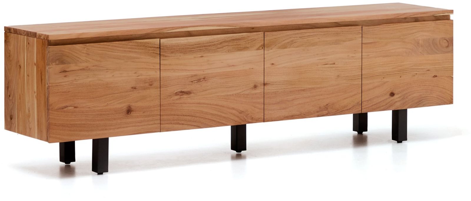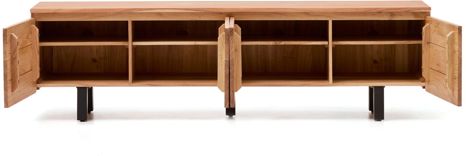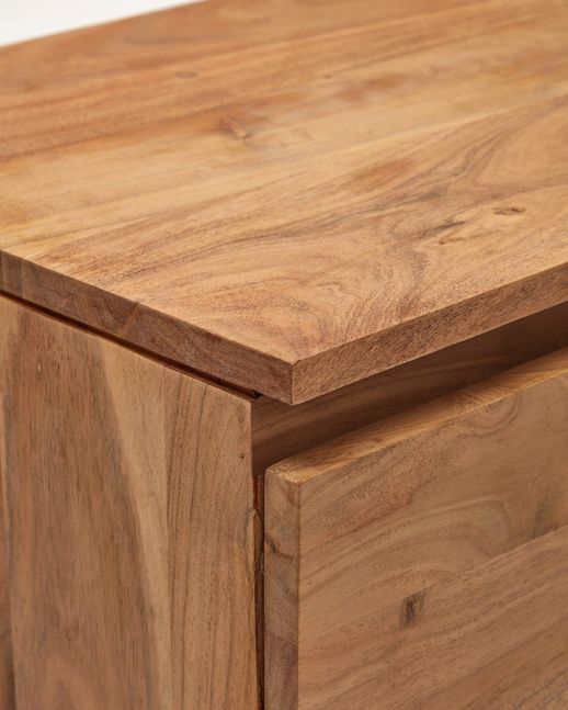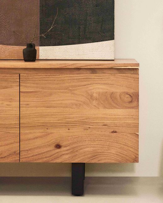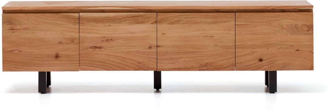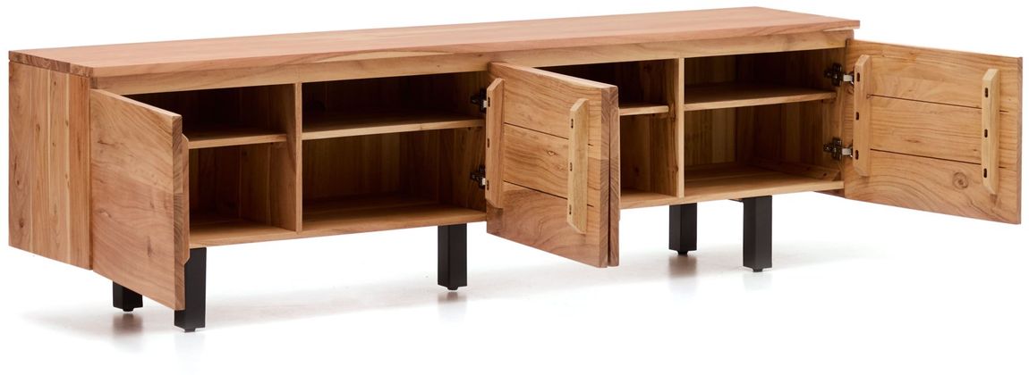 Tv-meubel Uxue van Kave Home is een robuuste en stijlvolle basis voor de zithoek. Het meubel is vervaardigd uit massief acaciahout, waardoor elk exemplaar een uniek houtpatroon en een eigen karakter heeft. De strakke lijnen geven het tv-meubel een moderne uitstraling en dragen bij aan een rustig en ruimtelijk geheel in de woonruimte. Uxue vormt daarmee een mooi contrast met zachtere, ronde vormen in het interieur en zorgt voor een gebalanceerde uitstraling.