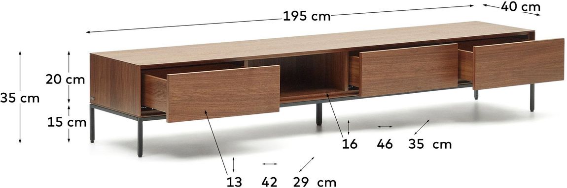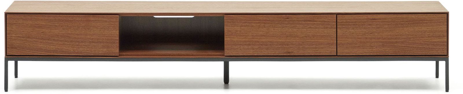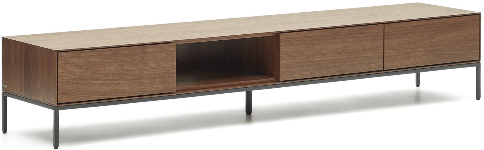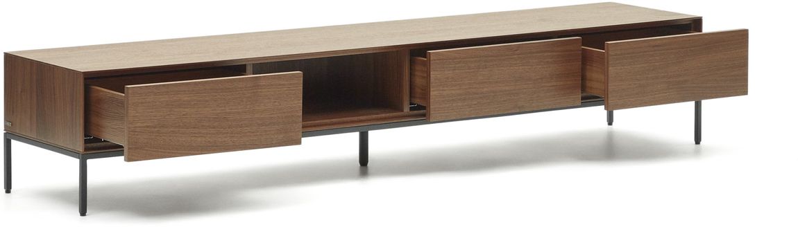 Tv-meubel Vedrana van Kave Home is een moderne en eigentijdse toevoeging die past in diverse interieurstijlen. Het meubel is vervaardigd uit walnoot fineer en rust op een rank, zwart onderstel, wat zorgt voor een stijlvolle uitstraling. Met drie ruime lades biedt Vedrana volop opbergruimte, terwijl het open vak zich ideaal leent om je mooiste woonaccessoires in het zicht te zetten.