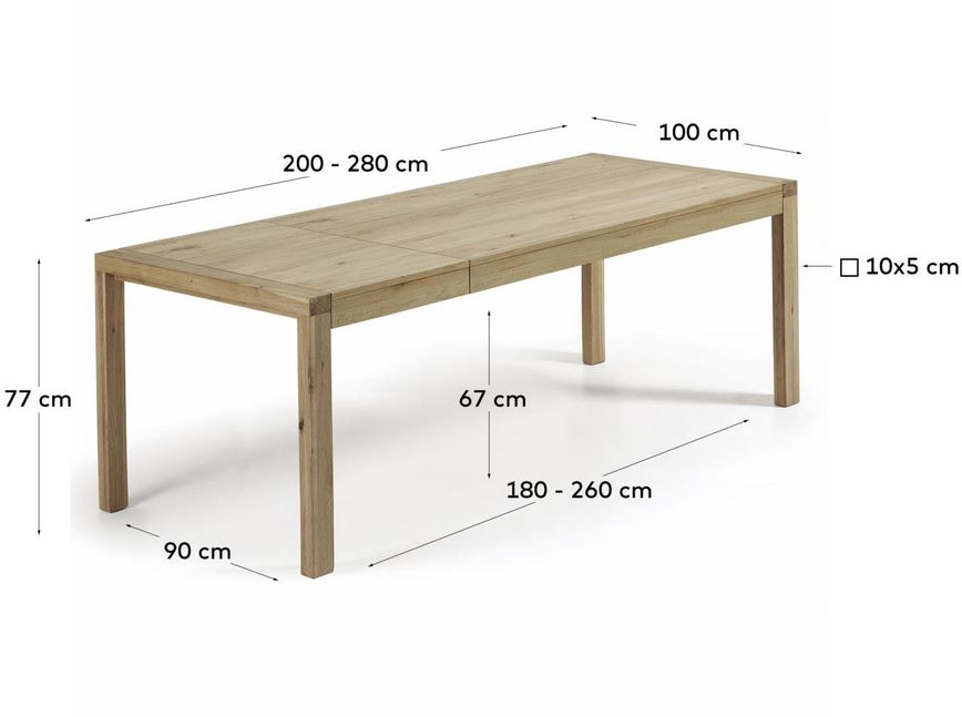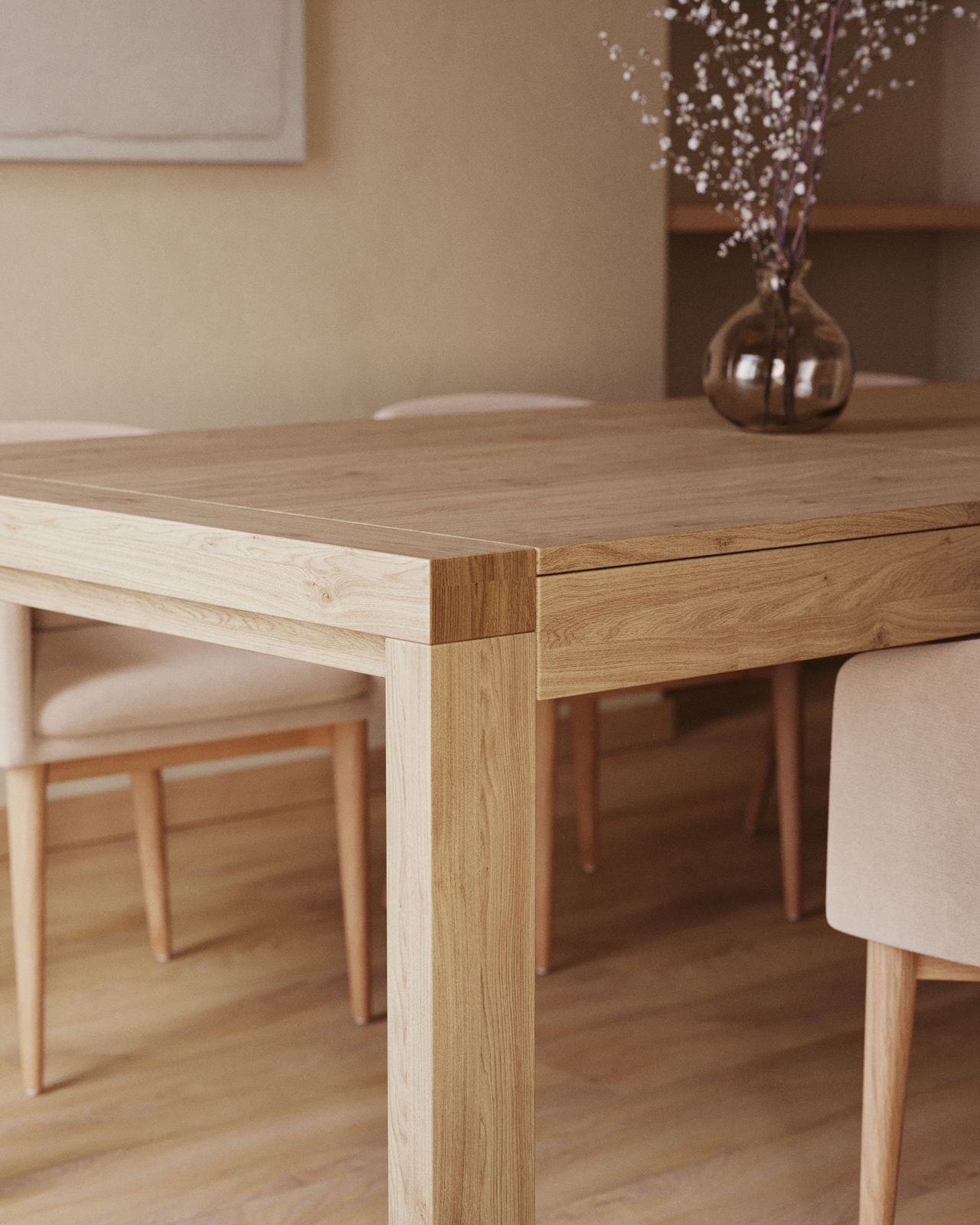 Uitschuifbare eettafel Vivy van Kave Home is gemaakt voor samen genieten. Het eiken fineer blad met natuurlijke afwerking maakt elke tafel uniek, dankzij de bijzondere nerven en kleurschakeringen. Met het geïntegreerde verlengstuk van 80 cm vergroot je de tafel moeiteloos, waarbij de poten in de hoeken blijven voor optimaal comfort. Zo ontstaat er extra ruimte om met nog meer gasten plaats te nemen en samen sfeervolle momenten te beleven.