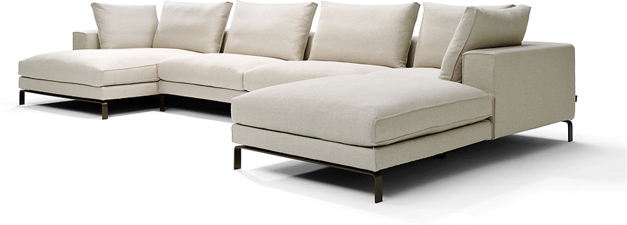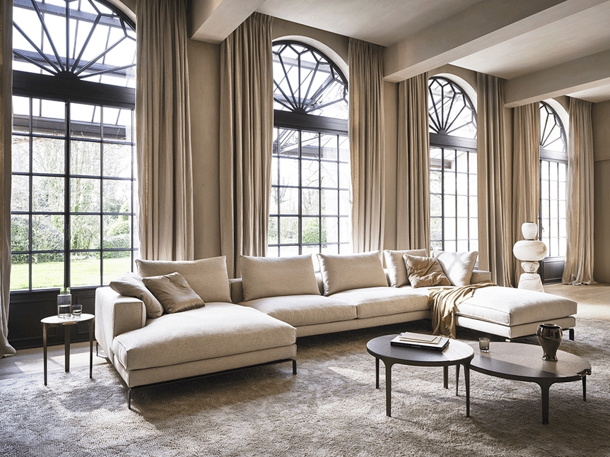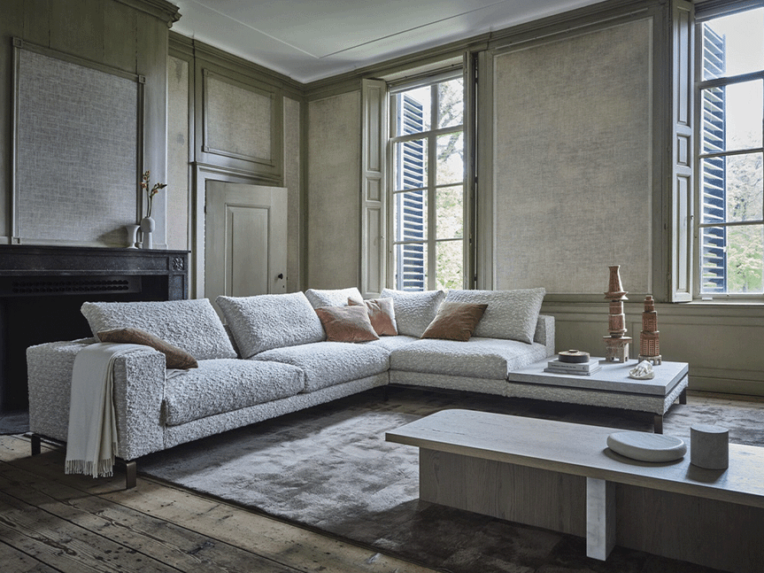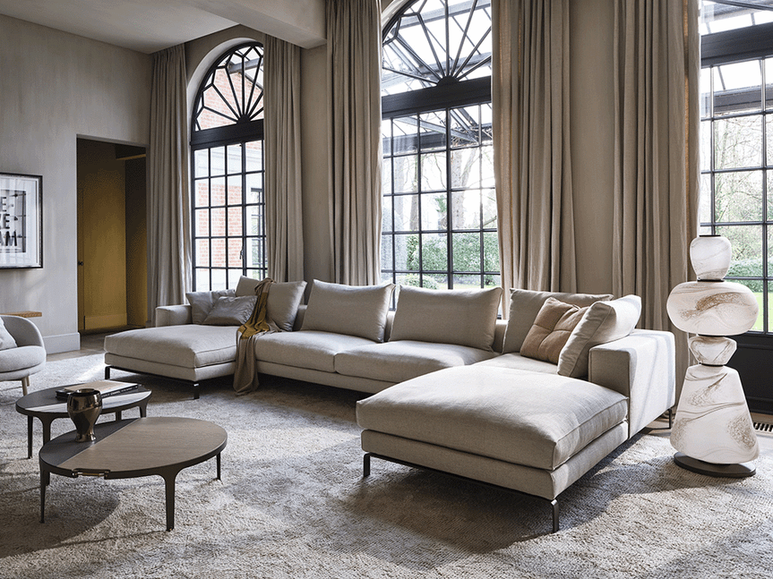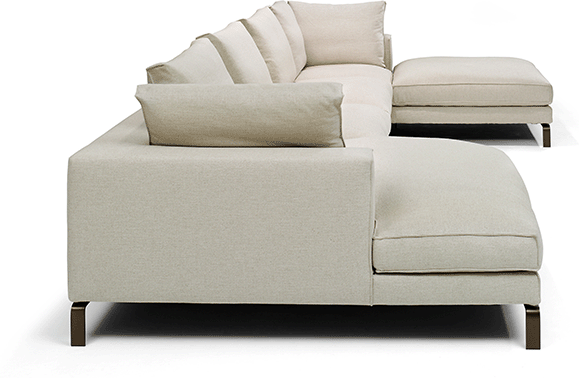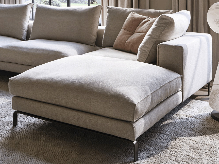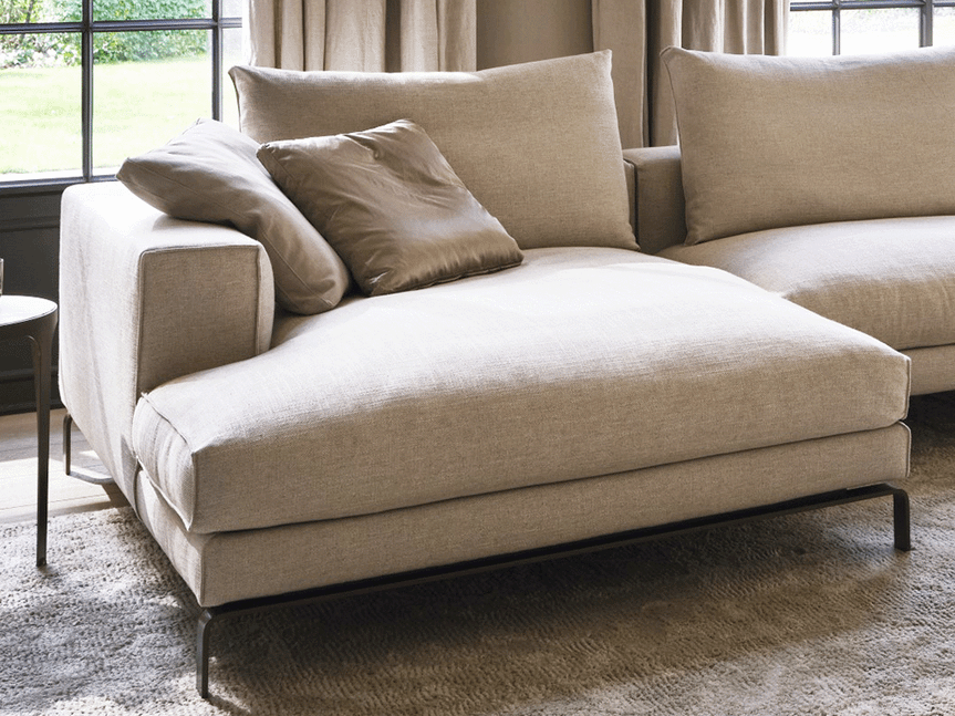 De royale zit is opgebouwd uit een kern van polyurethaanschuim, afgewerkt met een 100% katoenen dekbed gevuld met ganzendons en veren of een hypoallergene polyestervezel. Dit zorgt voor een aangenaam zitcomfort. Het elegante frame met slanke, verfijnde poten geeft de bank een luchtige uitstraling, waardoor het ontwerp optisch lijkt te zweven in de ruimte.