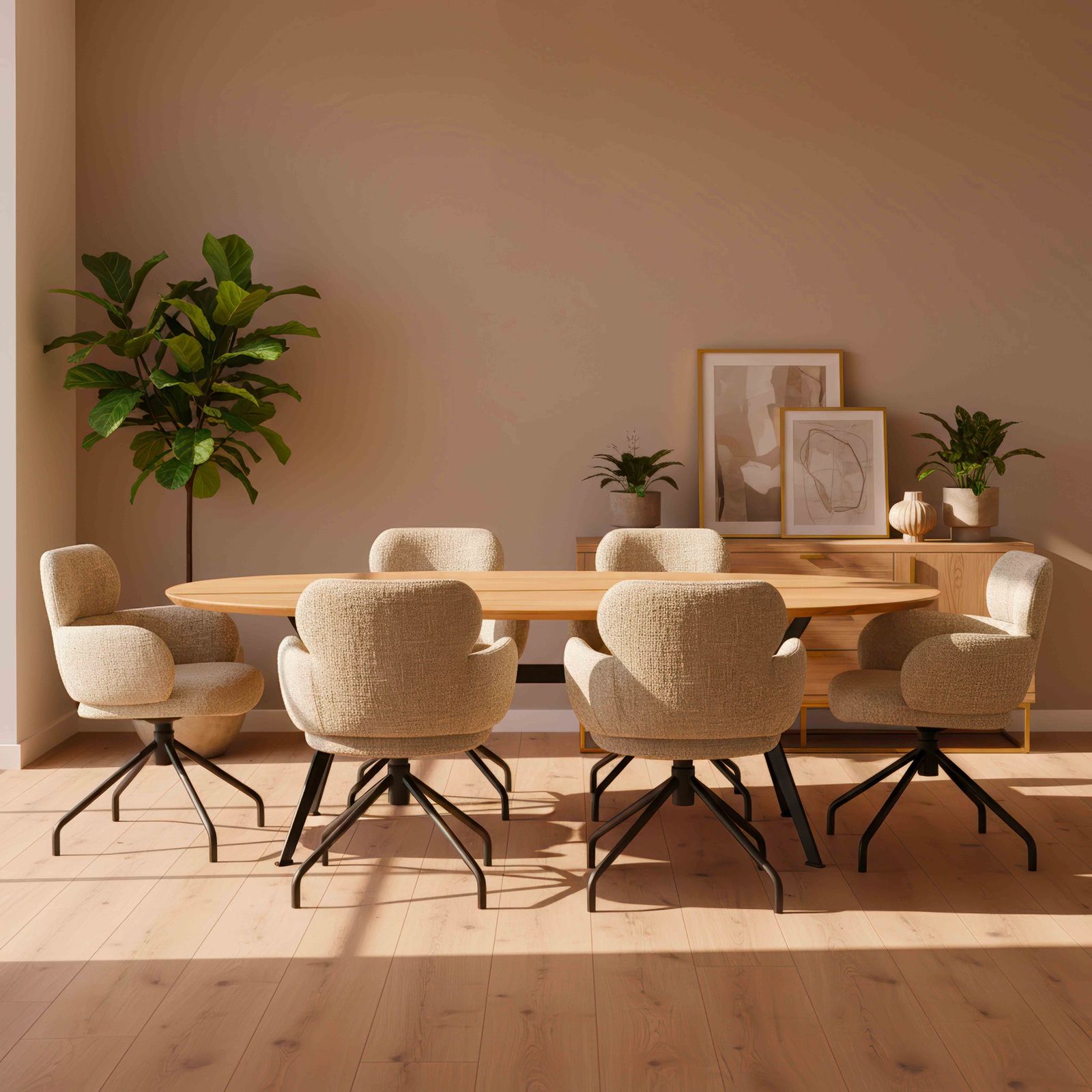 Getoonde uitvoering is bekleed met de stof Be Great in de kleur Cream: een hoogwaardige bekleding met een zachte, geweven structuur. Deze stof voelt prettig aan en is slijtvast, wat bijdraagt aan het zitcomfort én de levensduur van de stoel. Dankzij het centrale onderstel in matzwart met vier slanke poten oogt Abel luchtig, maar staat hij tegelijkertijd stevig op zijn plek.