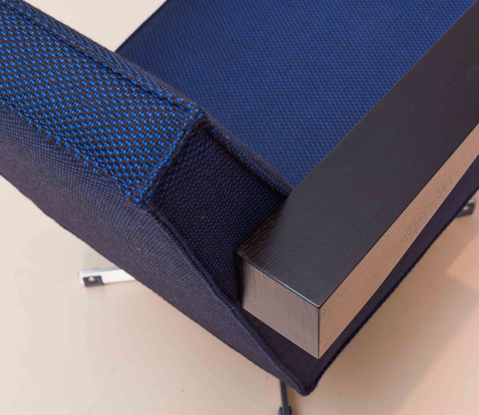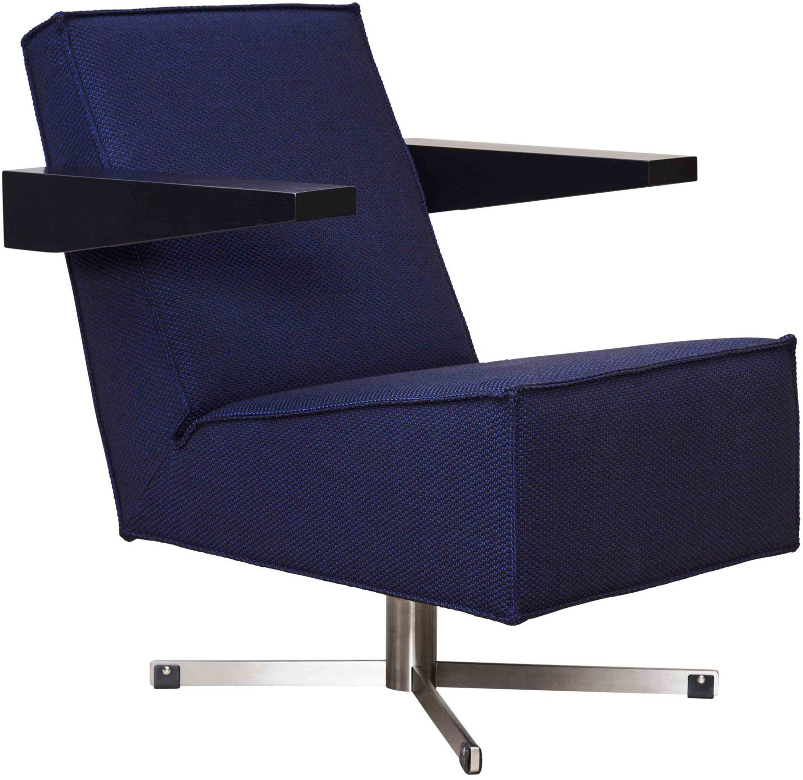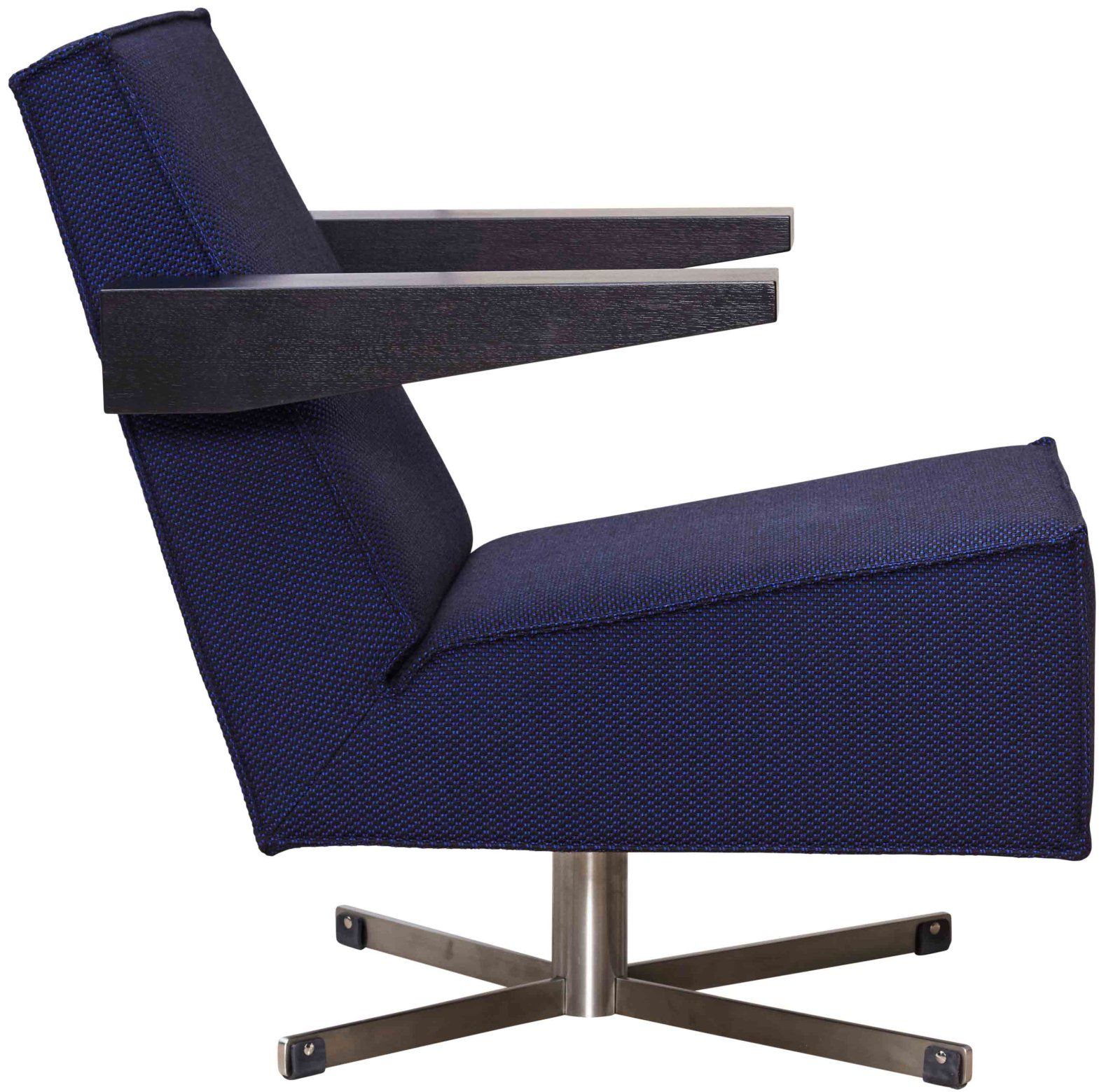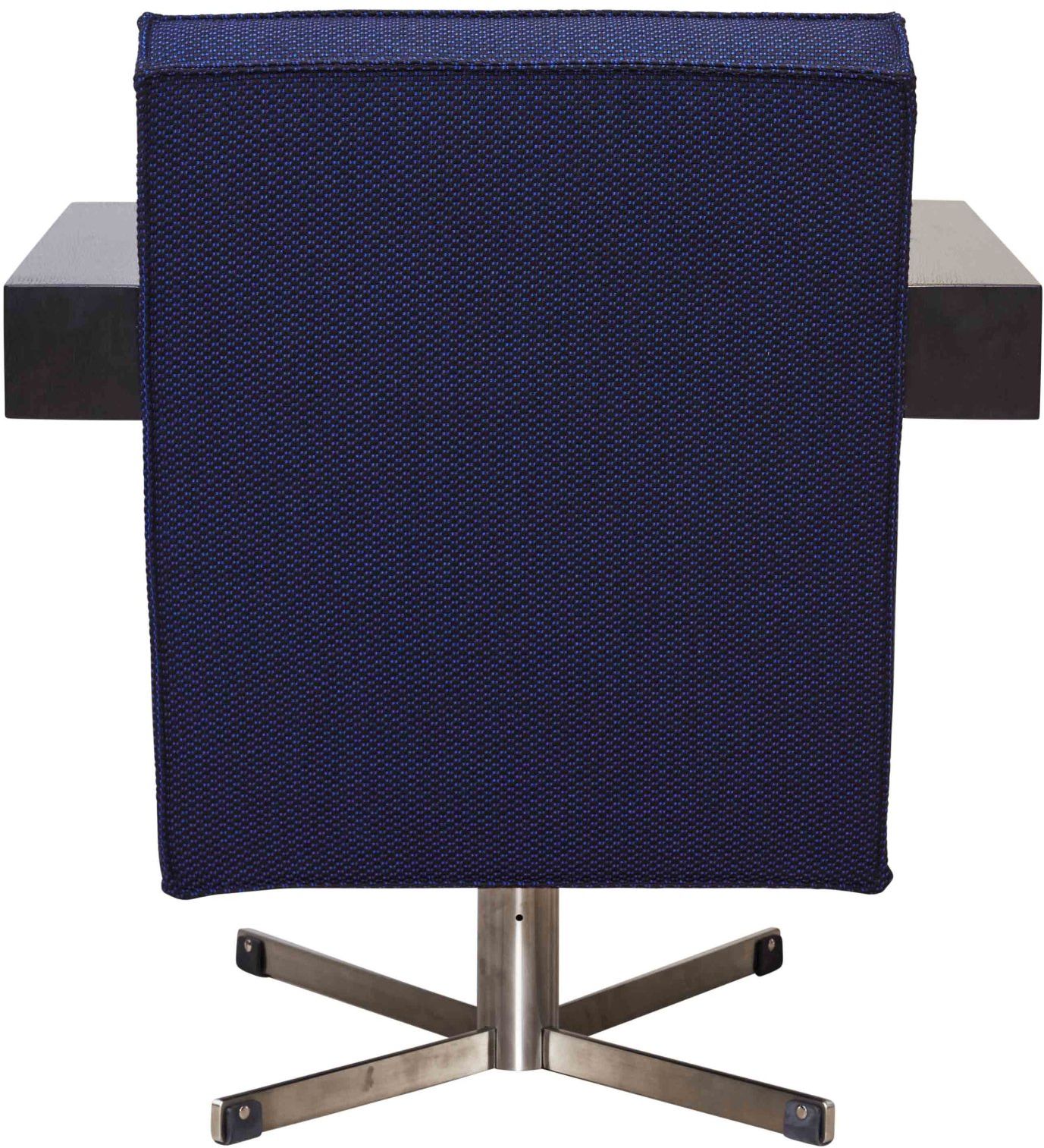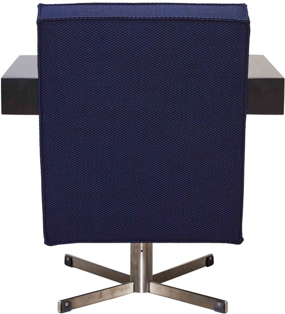 Prijs zoals getoond is gebaseerd op Press Room fauteuil van Pastoe, uitgevoerd in stof Serpentine van Kvadrat met een RVS onderstel en zwart gebeitste armleggers.