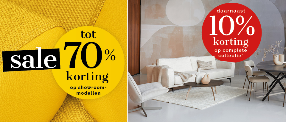 Profiteer nu van kortingen tot 70% op 500+ showroommodellen! Bekijk online de deelnemende meubelcategorieën en ontdek de gehele sale collectie in onze woonwinkels in Zutphen & Veenendaal.