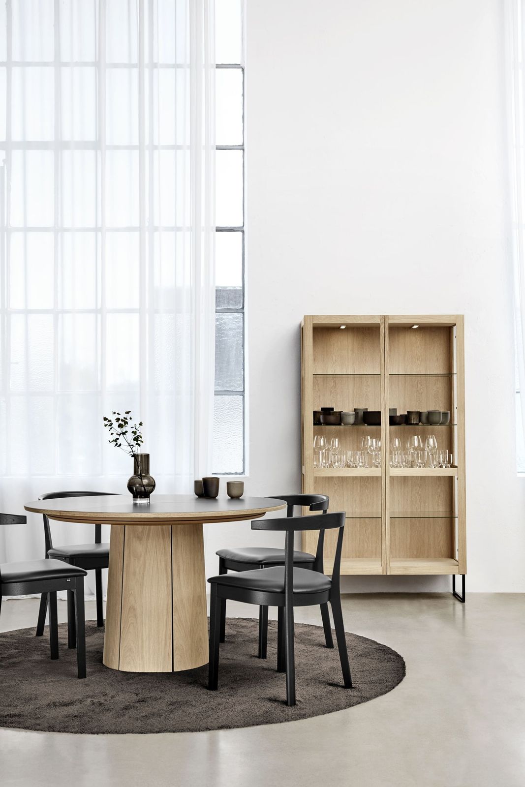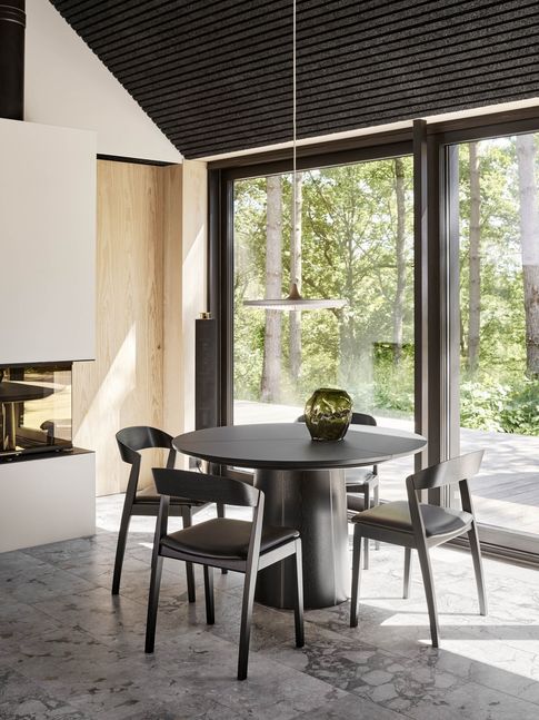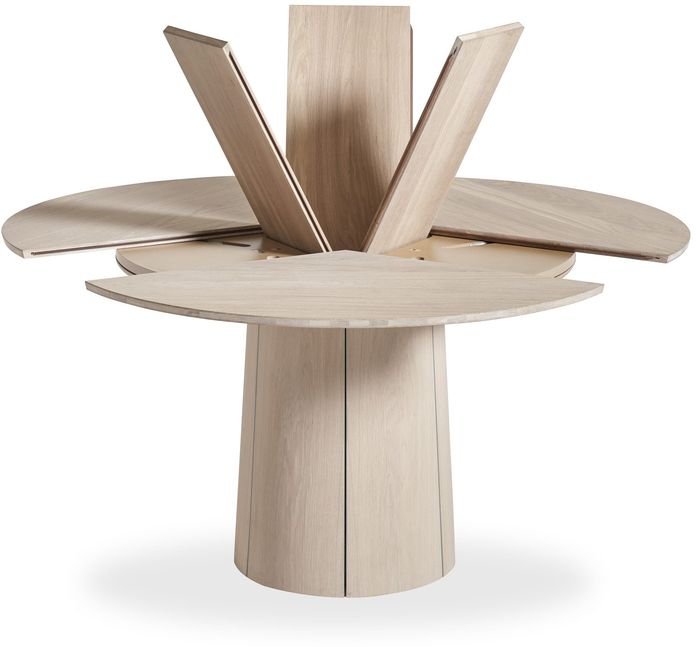 Eettafel SM33 van Skovby is geen alledaagse eettafel. Het unieke ontwerp heeft een tafelblad bestaand uit drie opklapbare bladeren, die zich verborgen houden in het onderstel. De uitschuifbare eettafel is voorzien van een eikenfineer tafelblad en -poot, en zijn geïmpregneerd met zwarte lak.