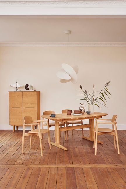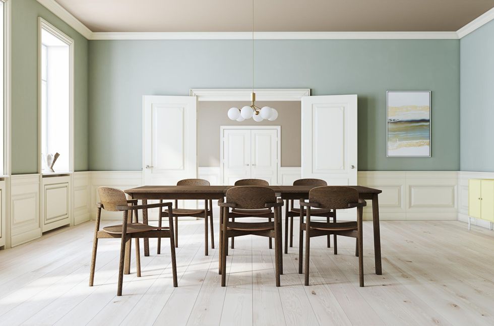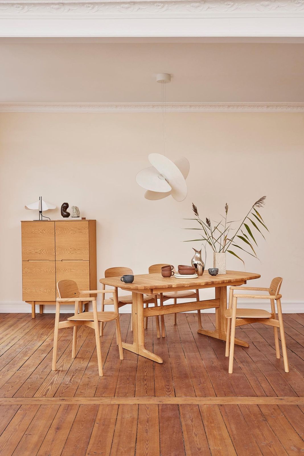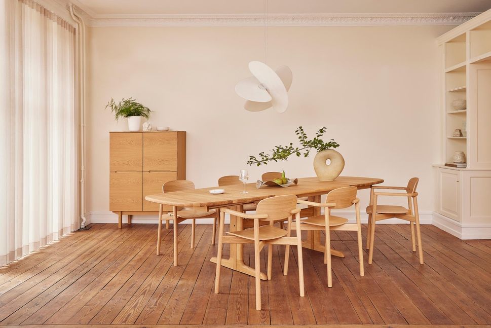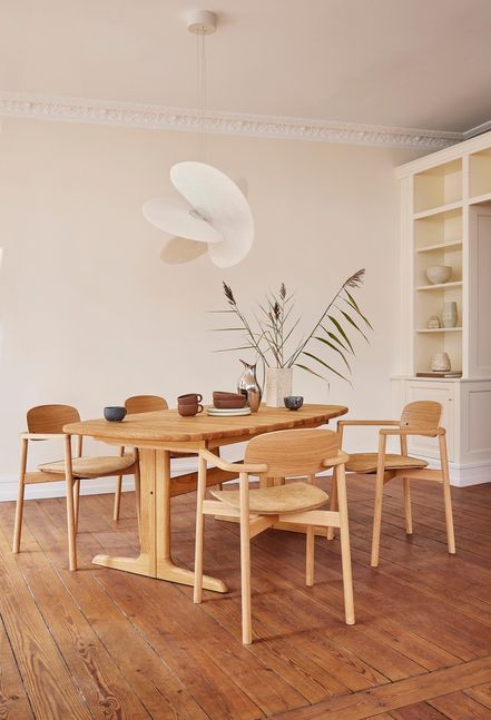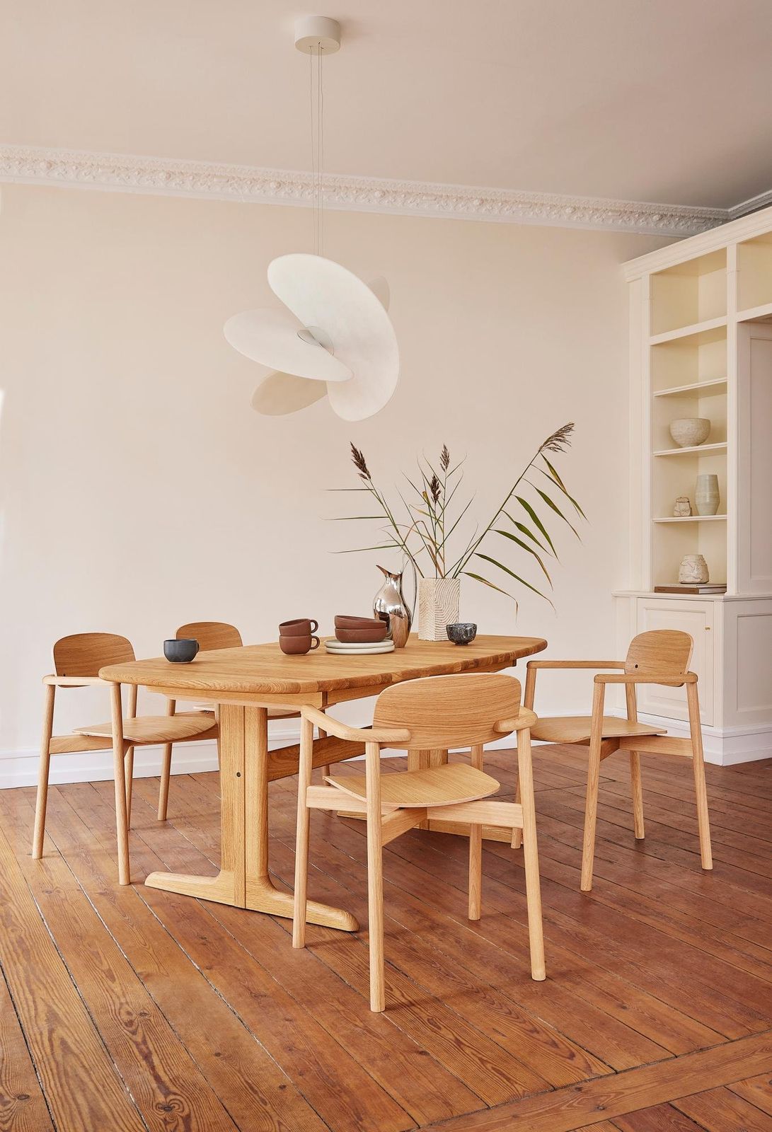 Eetkamerstoel SM842 van Skovby straalt rust en verfijning uit en vormt een subtiel, maar karaktervol element in de eetruimte. Het slanke ontwerp zorgt voor een luchtige uitstraling en laat de ruimte optisch groter aanvoelen. De geïntegreerde armleuningen bieden extra ondersteuning en dragen bij aan een comfortabele, actieve zithouding aan tafel.