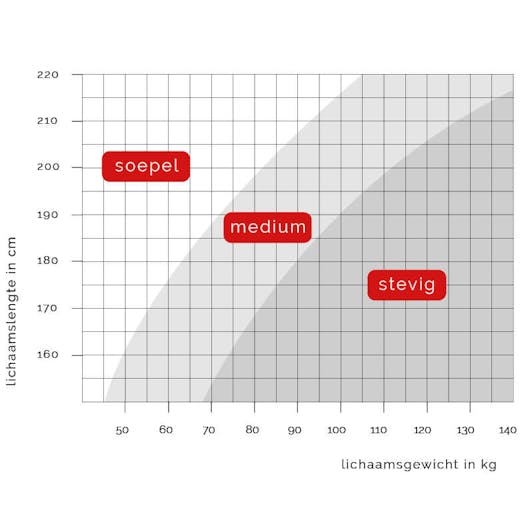 Het juiste comfort van uw matras bepalen wij op basis van uw lengte en lichaamsgewicht. Heeft u gemiddelde lengte en lichaamsgewicht met een BMI tussen de 20 en 25, dan slaapt u meestal het prettigst op een medium matras. Is uw BMI hoger of lager? Dan ligt u vaak het fijnst op een stevig of soepel matras.