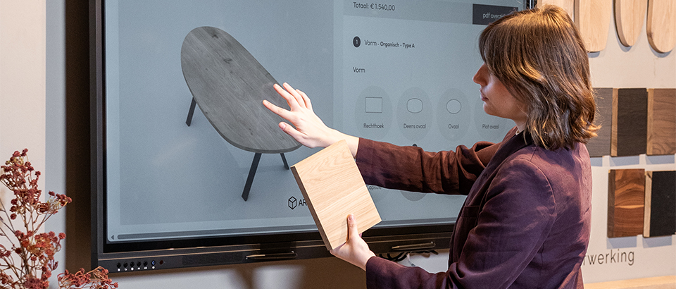 Stel digitaal jouw ideale tafel samen met eindeloze combinaties in bladvormen en tafelpoten.