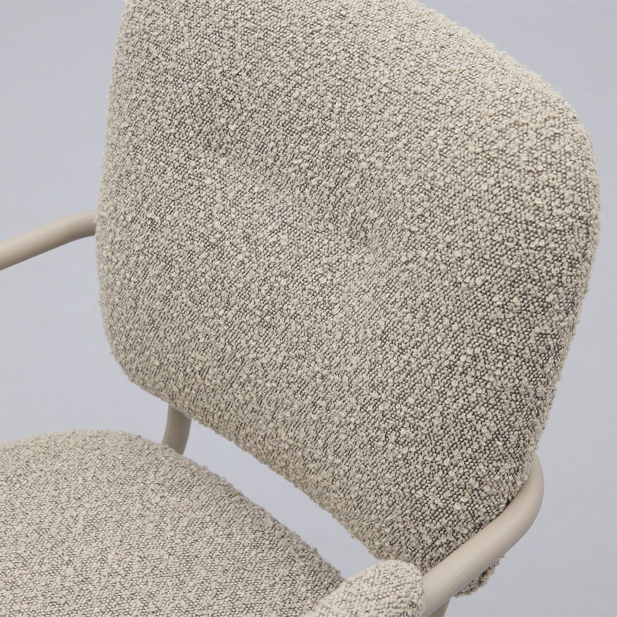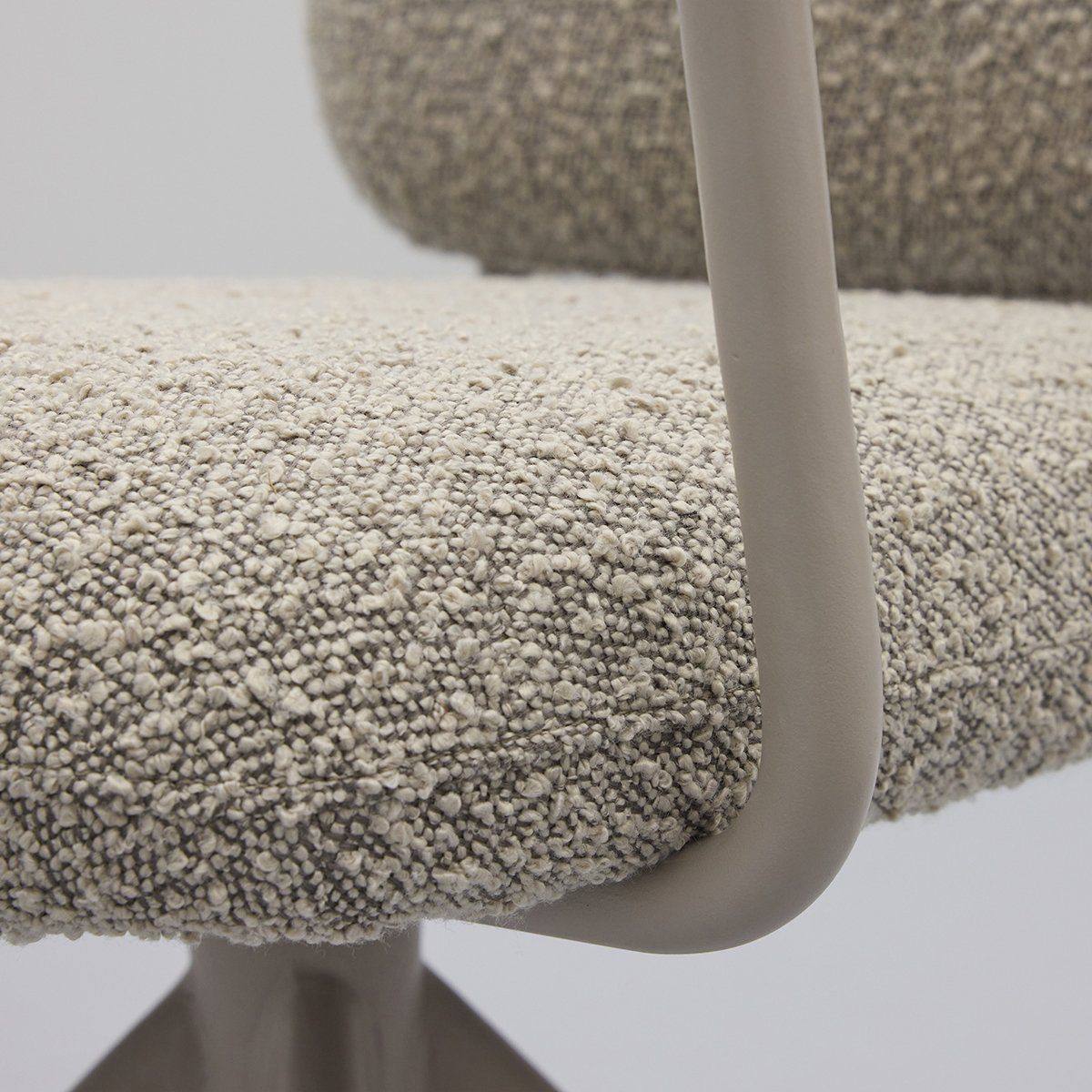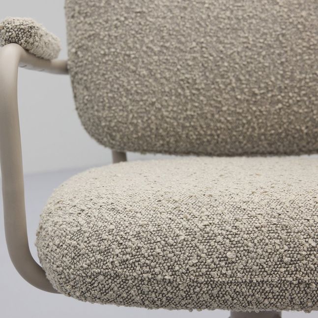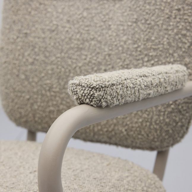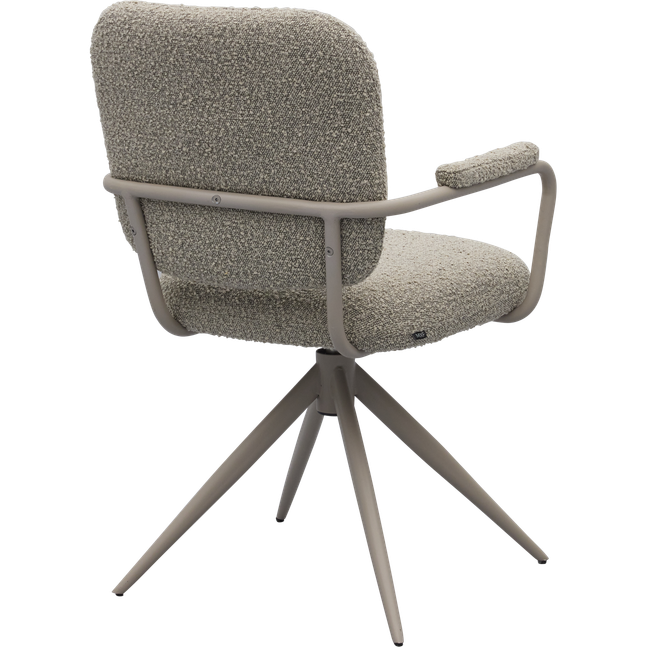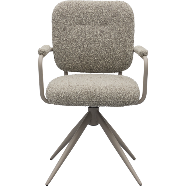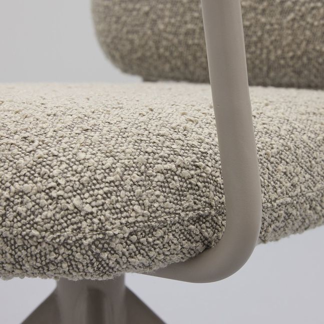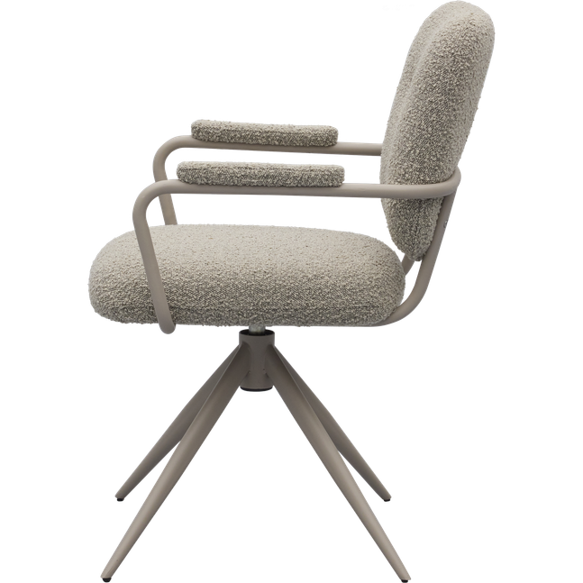 Eetkamerstoel Cielo van Trendhopper brengt een Scandinavische sfeervolle uitstraling naar de eethoek. De stoel is bekleed met een bouclé stof in een warme toffee bruine kleur, wat zorgt voor een zachte en uitnodigende look. In combinatie met het taupekleurige onderstel ontstaat een rustig en eigentijds geheel dat moeiteloos aansluit bij diverse interieurstijlen. De afgeronde vormen en subtiel beklede armleuningen dragen bij aan een comfortabele zit en een harmonieus geheel aan tafel.