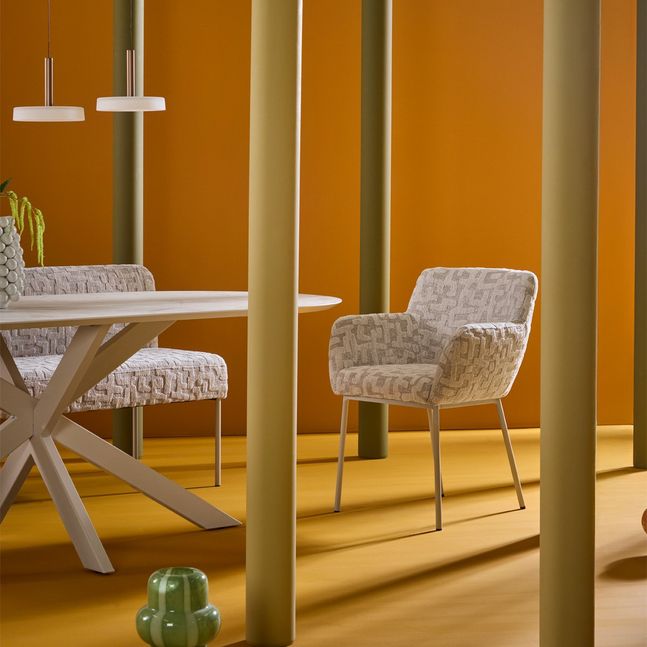 Eetkamerstoel Fano van Trendhopper is een echte blikvanger aan tafel. De zitting met uniek patroon geeft de stoel een opvallend karakter en maakt van jouw eethoek een stijlvol statement. De crèmekleurige poten zorgen voor een frisse, moderne basis en laten het design perfect tot zijn recht komen. Dankzij de zachte zitting en comfortabele armleuningen zit je heerlijk ontspannen.