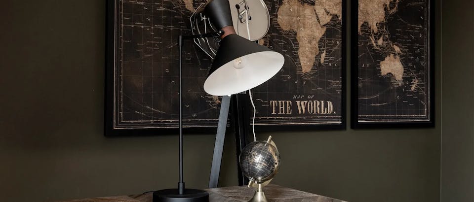 De zwarte industriële tafellamp is een klassieker binnen deze stijl. Zwart versterkt de stoere, technische uitstraling van het ontwerp en biedt tegelijkertijd een neutrale basis die moeiteloos aansluit bij andere kleuren en materialen in je interieur. Denk aan een zwart metalen bureaulamp op een houten dressoir of een matzwarte tafellamp op een marmeren sidetable. De contrasten maken het beeld krachtig en stijlvol.