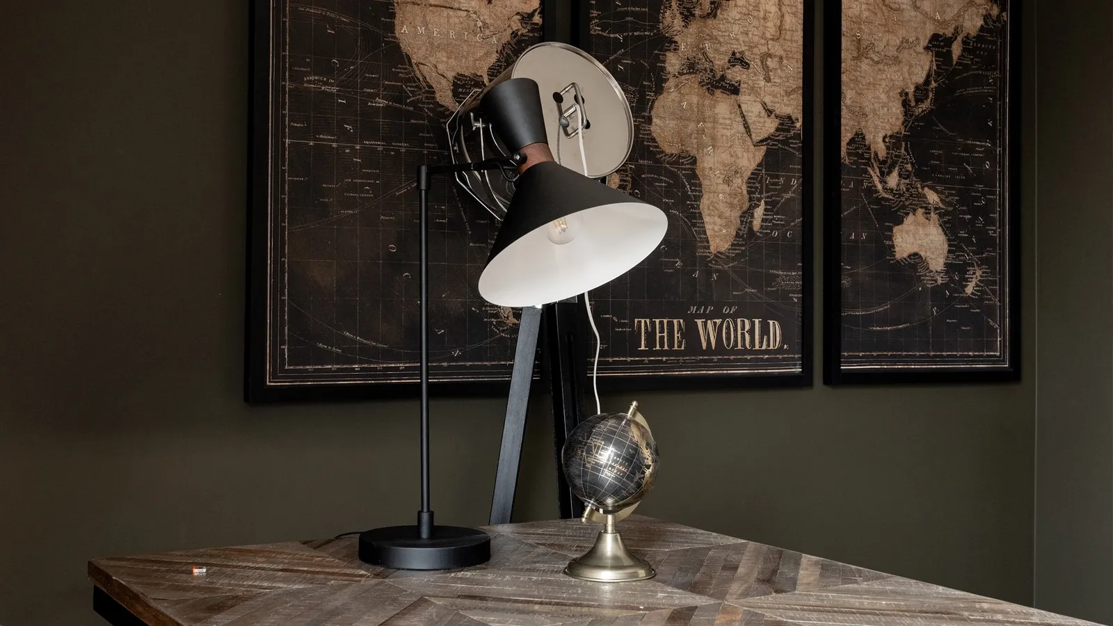 De zwarte industriële tafellamp is een klassieker binnen deze stijl. Zwart versterkt de stoere, technische uitstraling van het ontwerp en biedt tegelijkertijd een neutrale basis die moeiteloos aansluit bij andere kleuren en materialen in je interieur. Denk aan een zwart metalen bureaulamp op een houten dressoir of een matzwarte tafellamp op een marmeren sidetable. De contrasten maken het beeld krachtig en stijlvol.