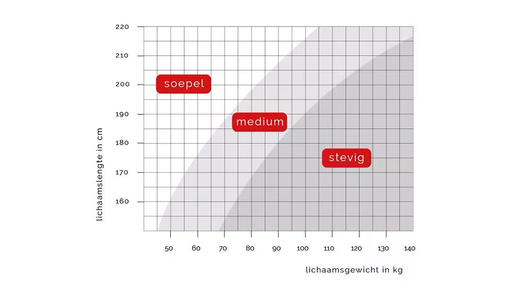 Het juiste comfort van uw matras bepalen wij op basis van uw lengte en lichaamsgewicht. Heeft u gemiddelde lengte en lichaamsgewicht met een BMI tussen de 20 en 25, dan slaapt u meestal het prettigst op een medium matras. Is uw BMI hoger of lager? Dan ligt u vaak het fijnst op een stevig of soepel matras.