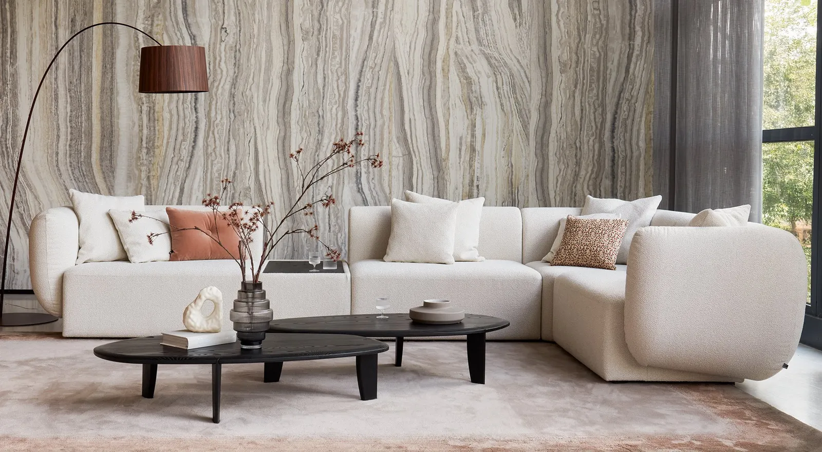 Naast ronde vormen, breng je ook eenvoudig warmte in huis met gebruik van de juiste materialen. Materialen als zijdezacht velvet en aaibaar bouclé geven je zitmeubels nét dat extra beetje comfort en zorgen voor een uitnodigende uitstraling. Maar denk ook aan warmgekleurd leder of hoogpolig wol. Combineer deze zachte materialen met levendig hout of marmer voor de perfecte balans. Tip: ga bij voorkeur voor licht hout. Donkere houtsoorten vormen wellicht een te groot contrast in je moderne interieur!