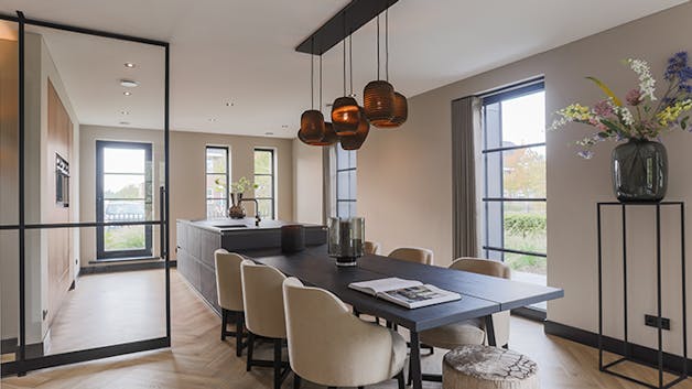 Een zwarte eetkamer kan een elegant en modern gevoel uitstralen. Kies voor een zwarte eettafel en combineer deze met stoelen in een contrasterende kleur of materiaal. Een zwart servies en glazen kunnen het geheel afmaken. Verlichting is hier wederom belangrijk: kies voor opvallende hanglampen boven de tafel om een statement te maken en zorg voor voldoende algemene verlichting. Overweeg het gebruik van zwarte wanddecoraties, zoals schilderijen of spiegels, om de muren te verfraaien. Als je niet helemaal klaar bent voor volledig zwarte muren, kun je kiezen voor zwarte panelen of lambrisering voor een subtiele en stijlvolle touch.