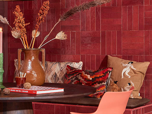 Geglazuurde rode wandtegels tegels, donker mangohout, recycled kunststof en saffraan kleurig metaal: de compacte eethoek is een bonte verzameling van vormen en materialen. De ronde eettafel is het centrale middelpunt en verbindt alle spectaculaire rood- en oranjetinten met elkaar. De XXL tegelwand van Sani Luxury loopt door in de betegelde eetkamerbank met stoer leren zitkussen.