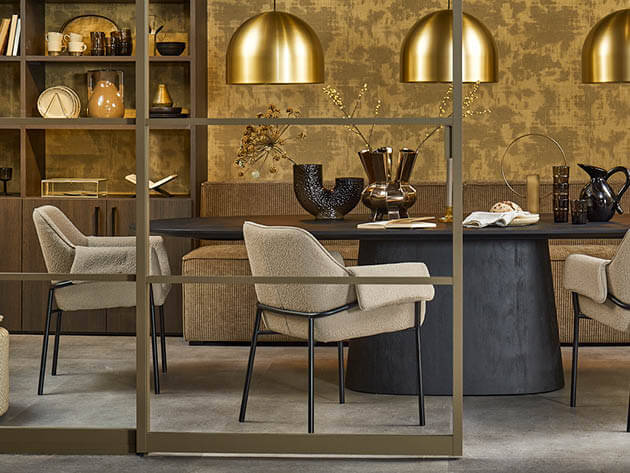 Met de schuifwand van Gewoon Gers in bronskleurig aluminium worden de zithoek en de eetkamer in woonstijl Golden Getaway als in een klassieke kamer en-suite van elkaar gescheiden. Zo zijn in de grote leefruimte twee aparte kamers gecreëerd die door de transparantie van de glaswand toch met elkaar in connectie staan. Dankzij het schuifmechanisme hoef je geen ruimte vrij te houden voor openslaande deuren, daarmee is deze transparante roomdivider ook geschikt voor de compactere woonruimte.