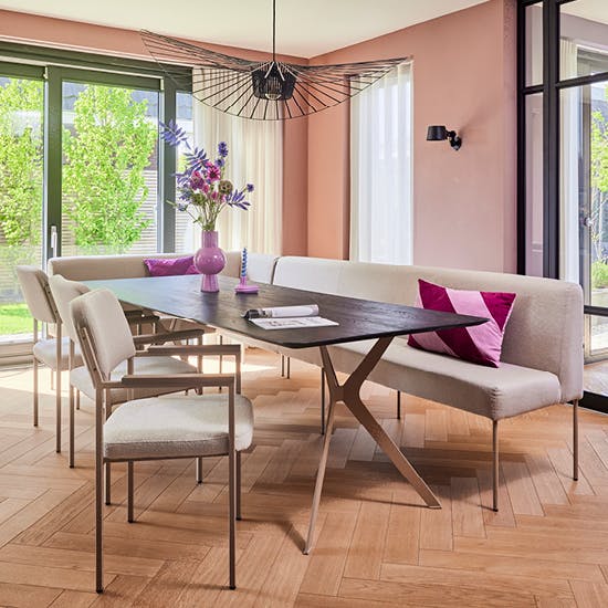 Bij een kleurrijk industrieel interieur draait het om contrast én harmonie. Denk aan zwart staal dat zichtbaar blijft, gecombineerd met een muurverf in greige of zacht taupe. Of kies blauw of roze als accentkleur op een wand en combineer met een stoffen fauteuil en metalen eetkamerstoelen. Het rauwe karakter van industrieel blijft voelbaar, maar wordt verzacht door natuurlijke materialen, kleurrijke details, warme houttinten en texturen zoals bouclé of linnen. Zo ontstaat een stijlvol geheel waarin het stoere industriële element wordt omarmd door gezelligheid.