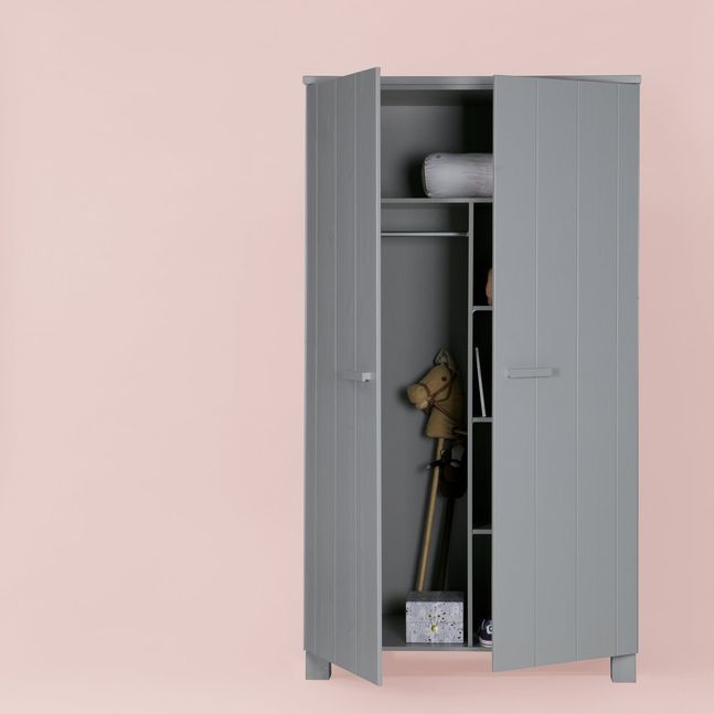 De stoere Woood kast Dennis is perfect als kledingkast in de slaapkamer of als extra opbergplek in de hal, voor bijvoorbeeld jassen, sjaals en schoenen. Vervaardigd van massief grenen, met een geborstelde afwerking, waardoor noesten en nerven nog meer geaccentueerd worden. Hierdoor krijgt de opbergkast een doorleefde uitstraling. De deuren zijn voorzien van een verticale v-groef belijning. De kast is voorzien van 2 deuren, links achter de deur bevindt zich een roede en aan de rechterkant is een leggedeelte. Daarnaast is er bovenin de kast nog een brede plank. Dennis is leverbaar in gespoten licht- en donkergrijs. Opbergkast Dennis is onderdeel van een compleet woonprogramma.