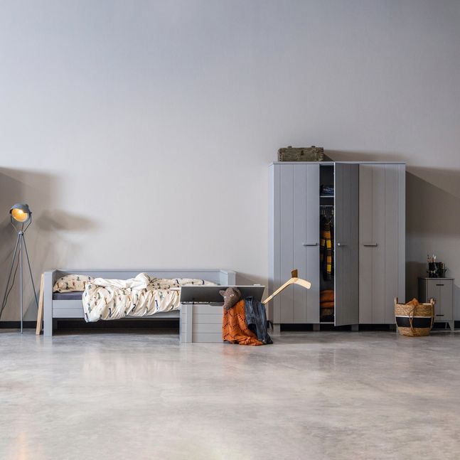 De stoere Woood kast Dennis is perfect als kledingkast in de slaapkamer of als extra opbergplek in de hal, voor bijvoorbeeld jassen, sjaals en schoenen. Vervaardigd van massief grenen, met een geborstelde afwerking, waardoor noesten en nerven nog meer geaccentueerd worden. Hierdoor krijgt de opbergkast een doorleefde uitstraling. De deuren zijn voorzien van een verticale v-groef belijning. De kast is voorzien van 2 deuren en twee lades, links achter de deur bevindt zich een roede en aan de rechterkant is een leggedeelte. Daarnaast is er bovenin de kast nog een brede plank. Dennis is leverbaar in gespoten licht- en donkergrijs. Opbergkast Dennis is onderdeel van een compleet woonprogramma.