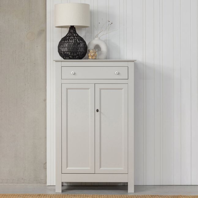 Opbergkast Eva van WOOOD is een eigentijdse kast met een brocante uitstraling. De kast is gemaakt van grenenhout en afgelakt in de kleur mist. Achter de deuren van de kast bevinden zich drie brede legplanken. Tevens is de kast voorzien van een lade met twee porseleinen knoppen. De deur kan worden afgesloten met een sleutel.