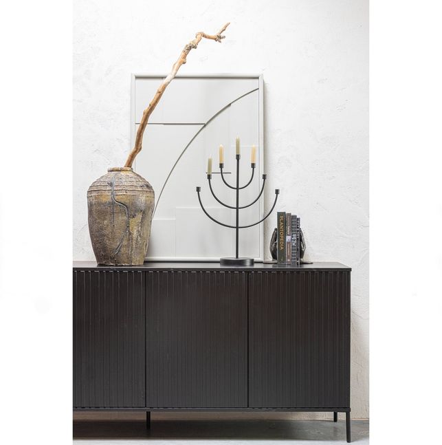 Dressoir Gravure uit de collectie van WOOOD biedt voldoende opbergruimte voor alle spullen die je graag uit het zicht opbergt. Achter de greeploze deuren met grafisch reliëf in de kleur Black bevinden zich acht vakken in de kleur zwart. De deuren zijn vervaardigd uit diepzwart gebeitst grenenhout, wat ervoor zorgt dat iedere Gravure kast met haar karakteristieke nerftekeningen uniek is.