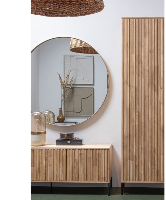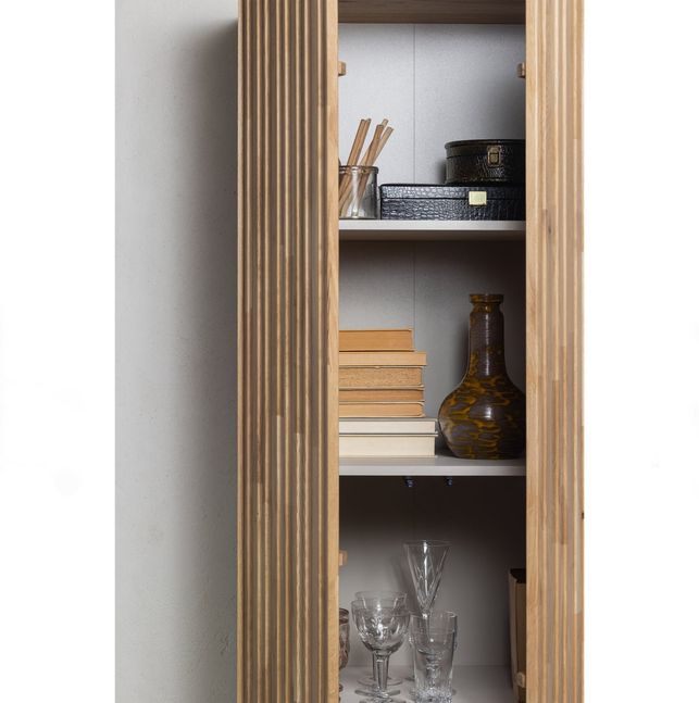 Met opbergkast Gravure van WOOOD worden alle spullen stijlvol opgeborgen achter hoge greeploze deuren met grafisch reliëf in de kleur Natural. De deuren zijn vervaardigd uit blank gebeitst eikenhout, wat ervoor zorgt dat iedere Gravure kast met haar karakteristieke nerftekeningen uniek is.