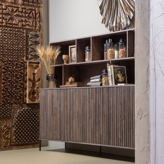 Met de Gravure opbergkast van WOOOD breng je een ideale wandkast in je interieur. De wandkast is gemaakt van essenhout met een espressokleurige beits. Dankzij de open schappen in de WOOOD opbergkast is hij geschikt voor het etaleren van persoonlijke woonaccessoires. Achter vier eiken deuren met grafisch reliëf berg je items op die je liever uit het zicht bewaart. Gravure is vervaardigd uit blank gebeitst eikenhout, het interieur is lichtgrijs. De deuren zijn voorzien van een push-to-open systeem, zodat je in alle stilte de kast kunt openen en sluiten.