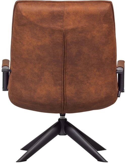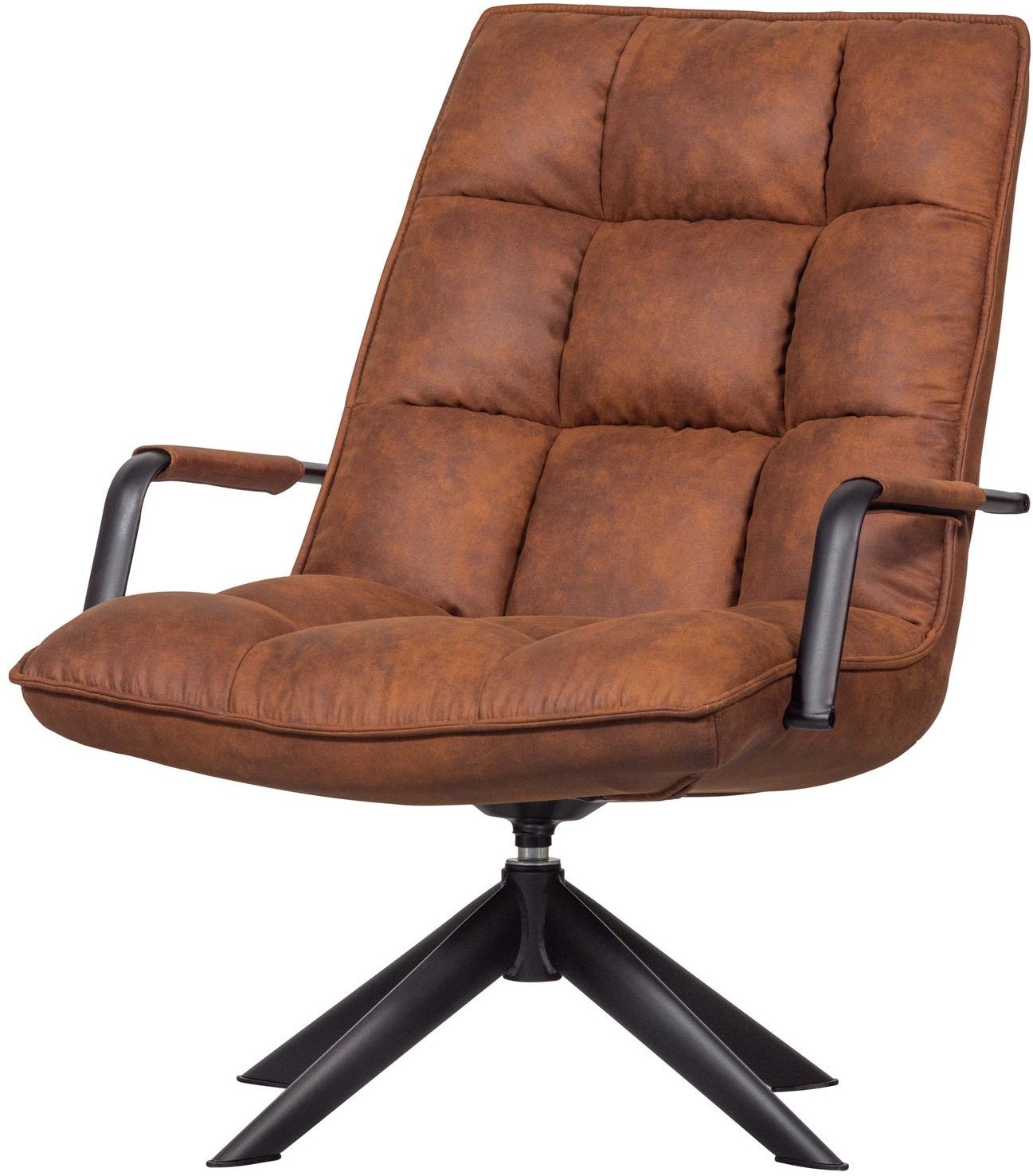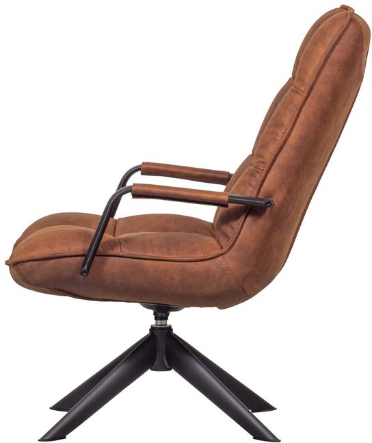 Ontspan in fauteuil Jouke van WOOOD door het royale zitcomfort van deze stoel. De zitting en rugleuning zijn gecapitonneerd waardoor de fauteuil klassiek oogt. De metalen stervoet staat in contrast met het cognac kunstleer. Een combinatie die zorgt voor een industriële uitstraling.