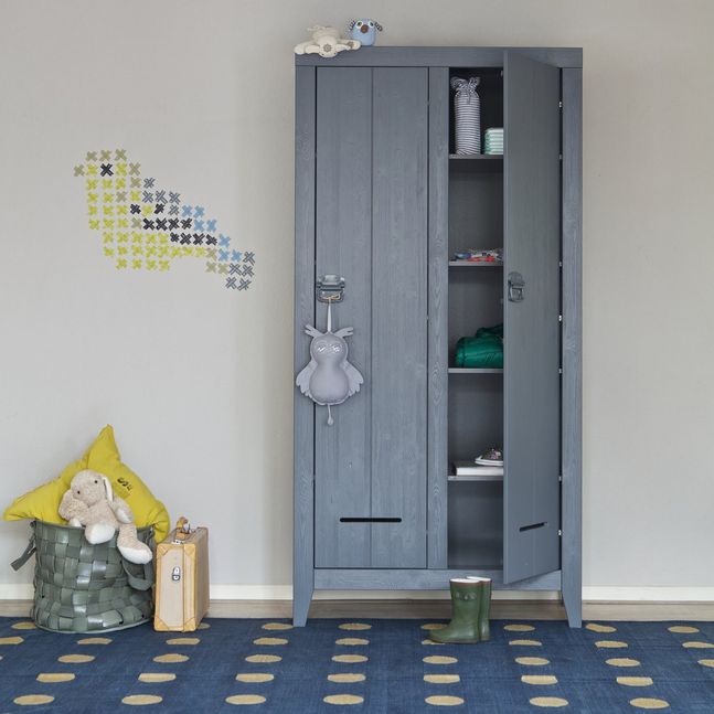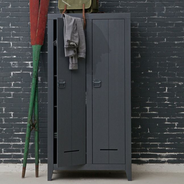 Opbergkast Kluiskast uit de Woood collectie is gemaakt van grenenhout en voorzien van een staalgrijze kleur. Het item bevat een stoere geborstelde afwerking, waardoor nerven en noesten subtiel worden geaccentueerd en een doorleeft uiterlijk ontstaat. Kluiskast is uitgerust met twee deuren, waarachter zich vijf legplanken bevinden.