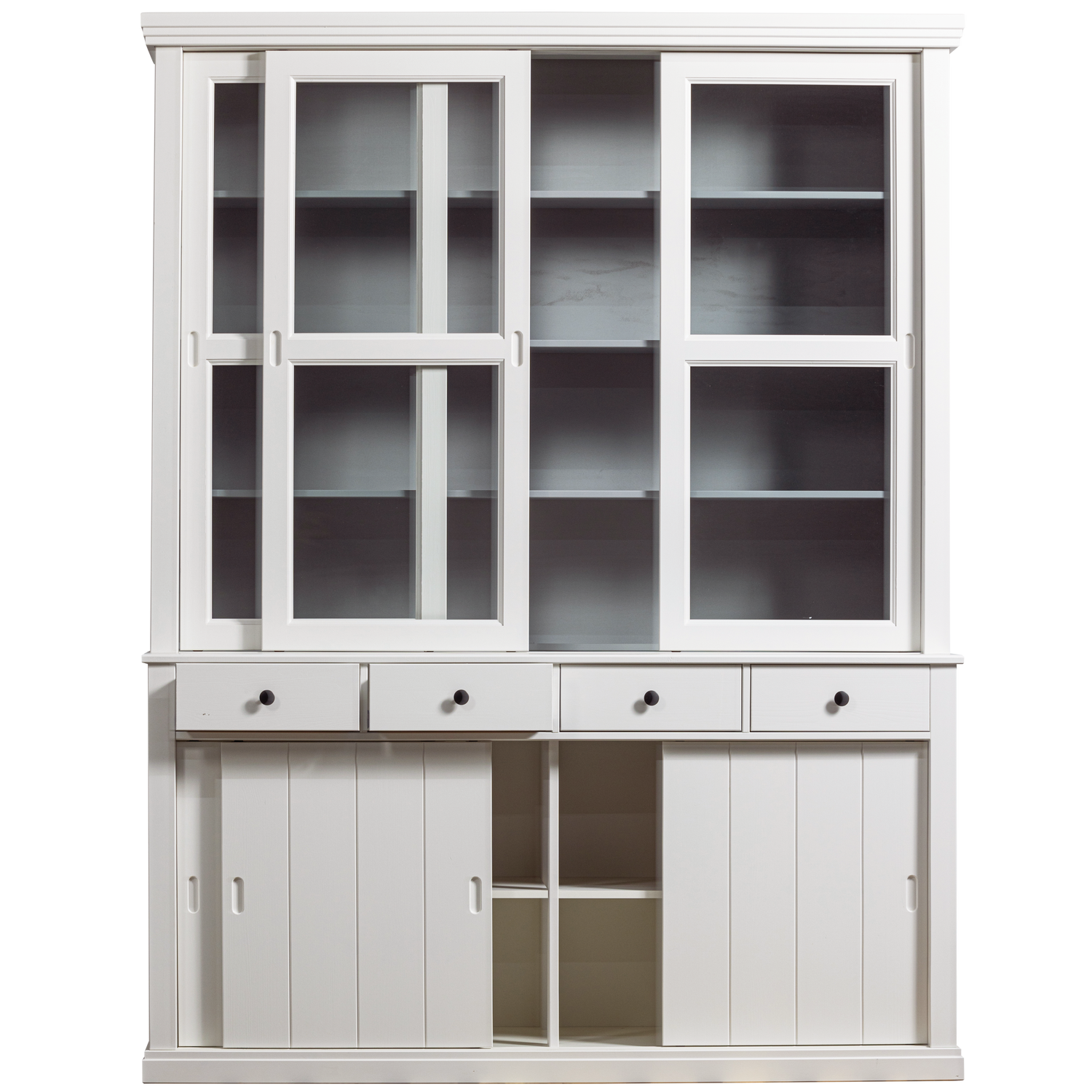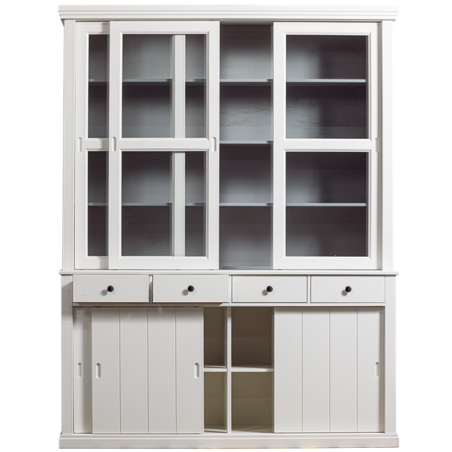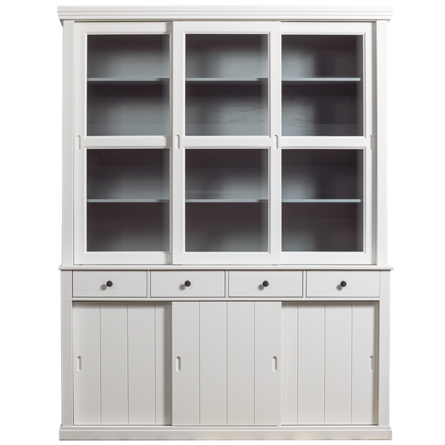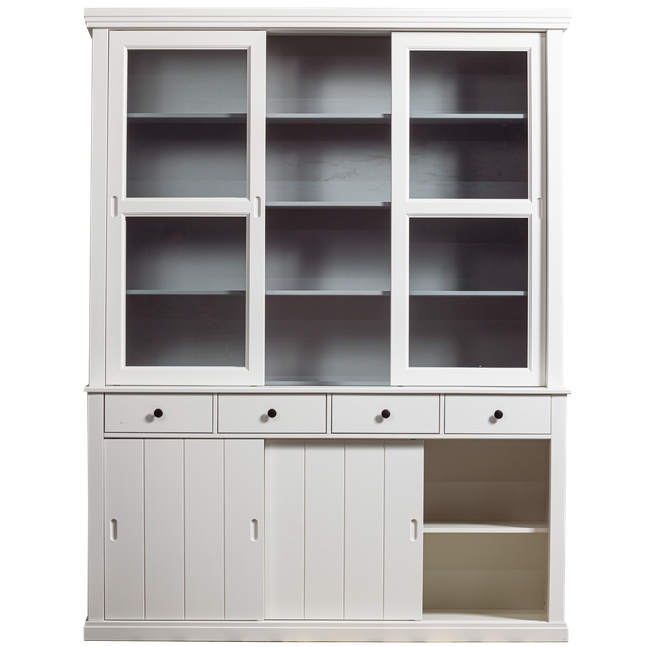 Vitrinekast Lagos van WOOOD is een robuuste kast met een landelijke uitstraling. De kast is gemaakt van grenenhout en voorzien van drie glazen en drie houten schuifdeuren. Achter de glazen schuifdeuren in het bovenste gedeelte van de kast is voldoende opbergruimte voor bijzonder servies en decoratie. Door de lichtgrijze binnenkant van de kast komen alle spullen goed tot zijn recht. Achter de houten deuren kunnen overige spullen worden opgeborgen. Tevens is de kast voorzien van vier lades. Bestel opbergkast Lagos van WOOOD online!