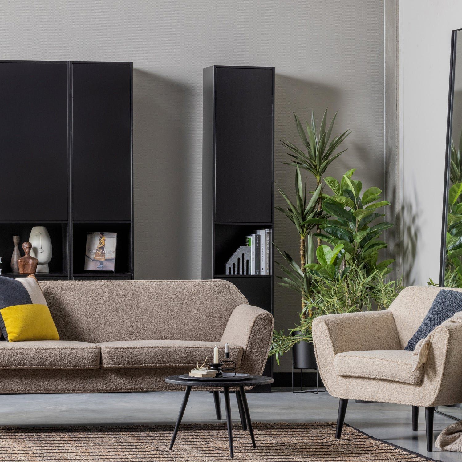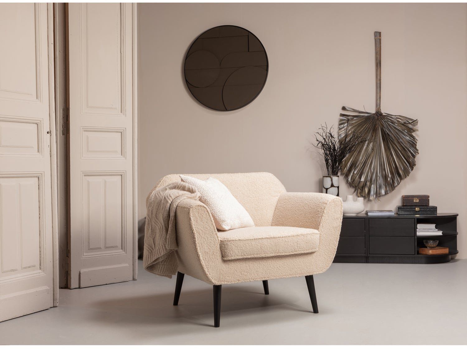 Kom heerlijk tot rust in de Rocco fauteuil uit de collectie van WOOOD. Deze stijlvolle stoel heeft een comfortabele zit dankzij de ondersteunende armleuningen en het royale zitvlak. De retro invloeden zoals de ronde vormen en schuine hoge poten passen perfect bij de bekleding. De bank is namelijk bekleed met een heerlijk zachte teddy stof. Dit vormt een subtiel contrast met de elegante, zwartgelakte pootjes. Liever een andere uitvoering? Dat kan! Rocco is in diverse materialen en kleuren verkrijgbaar.