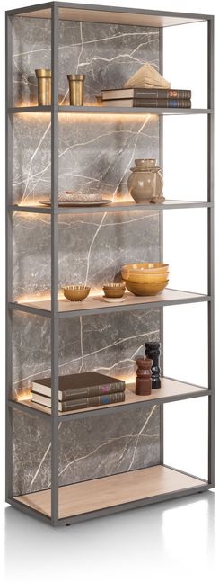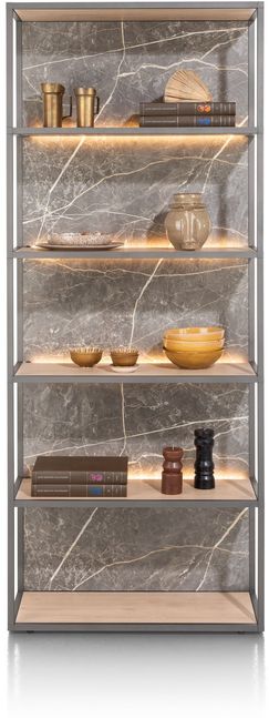 Verrijk je woonruimte met moderne boekenkast Helsinki uit de collectie van XOOON. Deze boekenkast combineert een grijs metalen frame met houten planken, wat resulteert in een eigentijdse uitstraling. Helsinki onderscheidt zich door de aanwezigheid van een marmeren achterwand. Daarnaast is elke plank voorzien van de mogelijkheid om verlicht te worden, waardoor jouw favoriete woonaccessoires op een schitterende manier worden belicht.
