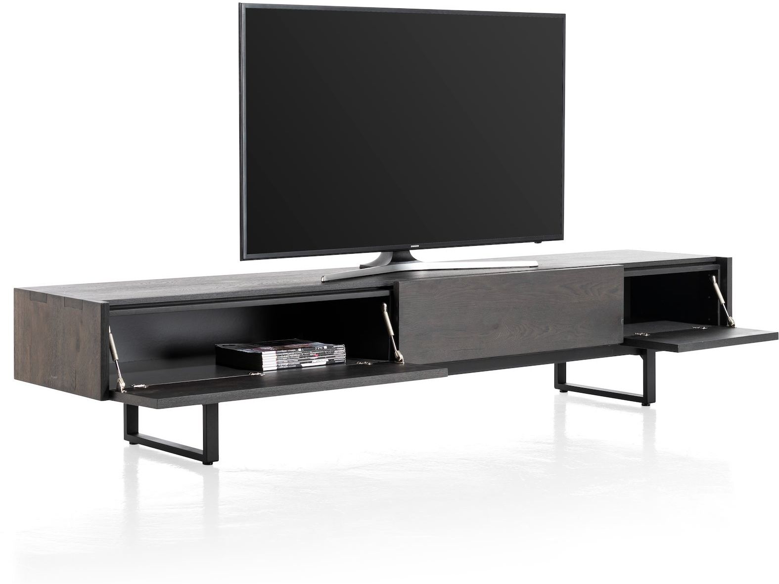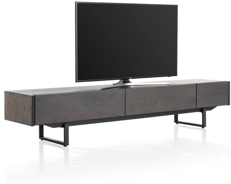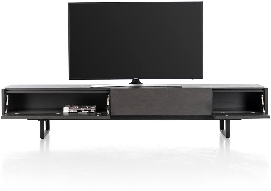 De tv-kast is 237 cm breed en is voorzien van een lade en twee kleppen waar voldoende ruimte is voor de afstandsbediening, kabels en andere tv-benodigdheden, maar ook voor een zacht plaid en andere items die je graag dicht bij de televisie opbergt. Modali staat op een zwart metalen slede onderstel. Naast getoonde uitvoering in zwart eikenfineer is Modali tevens verkrijgbaar in andere uitvoeringen.
