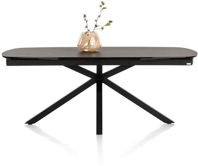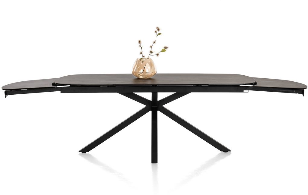 Het blad van de Montello uitschuiftafel steunt op een moderne, zwarte kruispoot. Een bijzonder vormgegeven blikvanger die ook nog eens praktisch is: doordat de poot centraal onder het tafelblad is bevestigd, geniet iedereen aan tafel van meer dan voldoende beenruimte.