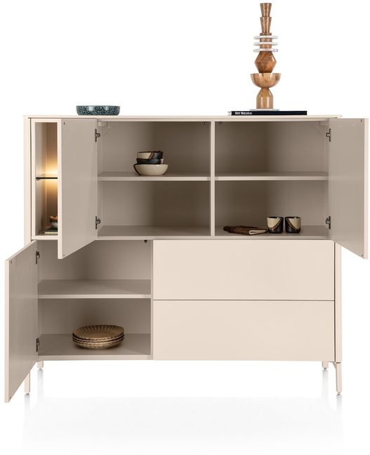 Dressoir Trentino van XOOON is een stijlvolle en functionele toevoeging aan je interieur, waarin een strak design en praktische opbergruimte naadloos samenkomen. Met zijn zachte creme kleur en minimalistische vormgeving straalt deze dressette rust en elegantie uit, waardoor hij moeiteloos past in een modern of Scandinavisch interieur. Achter de deuren berg je spullen netjes op en het open vak met verlichting geeft extra sfeer wat ideaal is voor accessoires die gezien mogen worden.